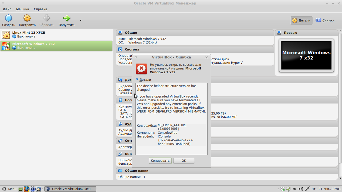 Всем доброго время суток. Не подключаются флешки к гостевой ОС в VirtualBox. Поставил нужный плагин, теперь при включении машины вылетает ошибка и машина стартует. Если же изменить настройки USB на 1.1, всё запуститься нормально. |