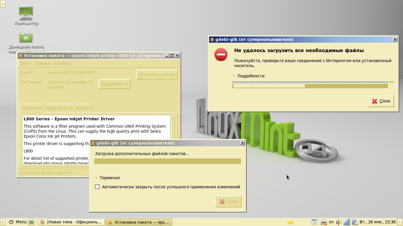 Принтер заводится с пол оборота, если только не специфический какой-то, просто подсоедините его. [/quote] Подключал. Требует драйвер. Установил через CUPS сервер, теперь просит фильтр, не знаю где взять. А дебпакет с дровами на епсон л800 не ставится Редактировалось: 1 раз (Последний: 26 января 2016 в 22:12) | ||||||