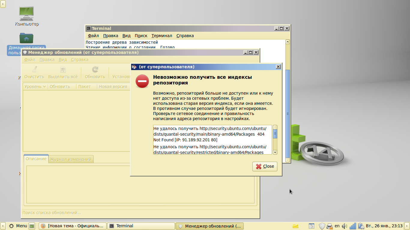 Linux Mint 14 Nadia уже не поддерживается, поэтому и бяка вылазит, какое у Вас "железо"? Давайте просто подберем дистрибутивчик для Вас. |