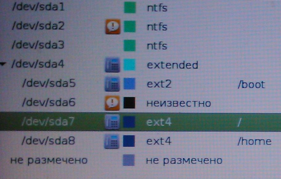 Да, корень- это sda7. Значит нужно с корнем работать. А /boot зачем нужен? Или снести нафиг этот /boot. И оставить только: / и /home, ну и /swap. | symon2014: | | Лучше покажи сначала /etc/fstab (только не с LiveCD, а с настоящей системы). |