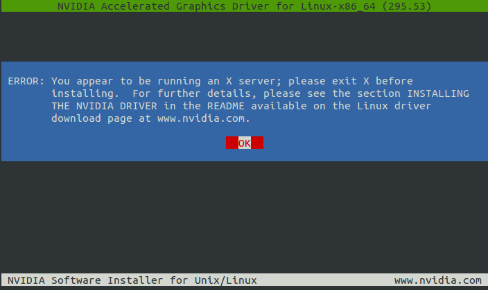 | ERROR: You appear to be running an X server; please exit X before installing. For further details, please see the section INSTALLING THE NVIDIA DRIVER in the README available on the Linux driver download page at www.nvidia.com. |