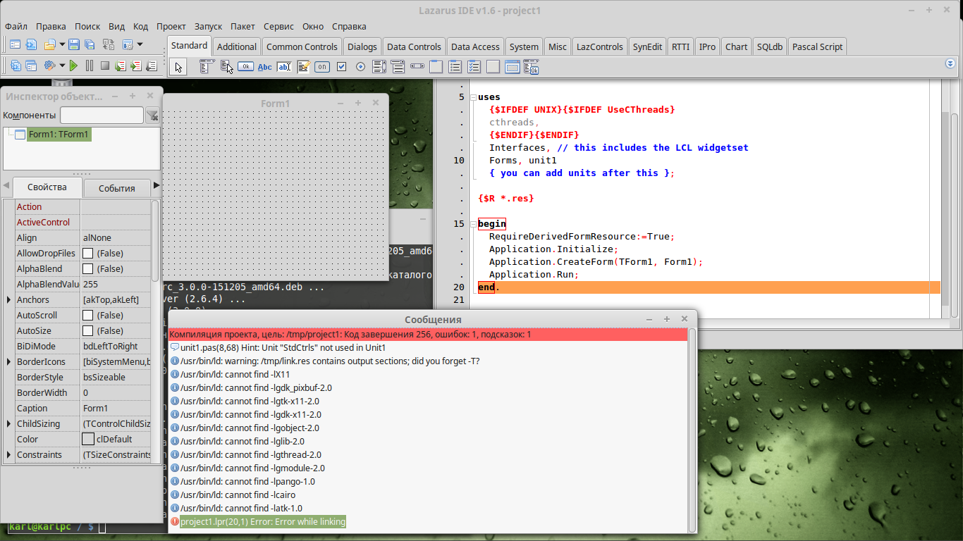 Скачал 3 дэб пакета fpc, fpc сорцы и сам лазарус. Всё стало хорошо, но вот при компиляции говорит такое. Скрин прилагаю. Прикрепленные файлы: