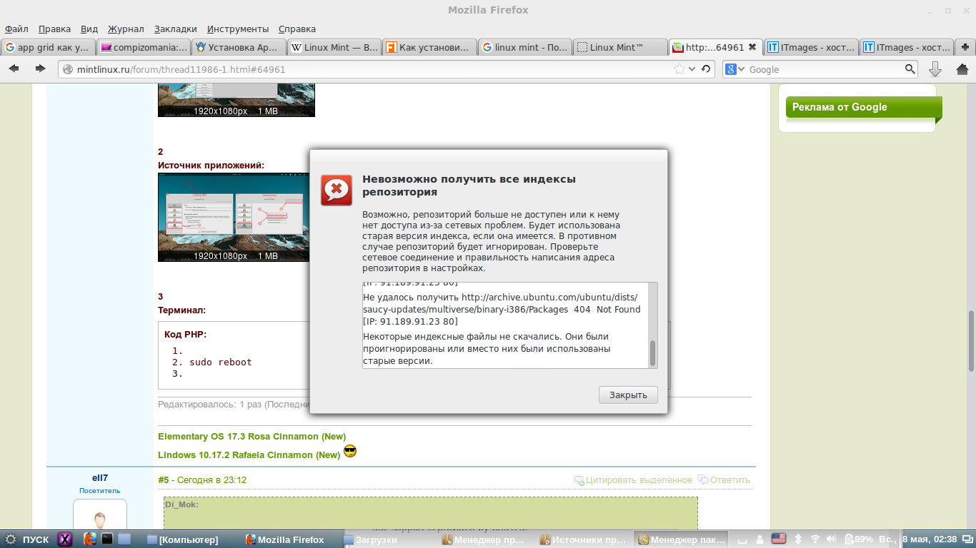 Не удалось получить http://security.ubuntu.com/ubuntu/dists/saucy-security/main/binary-i386/Packages 404 Not Found [IP: 91.189.91.26 80] Не удалось получить http://security.ubuntu.com/ubuntu/dists/saucy-security/restricted/binary-i386/Packages 404 Not Found [IP: 91.189.91.26 80] Не удалось получить http://security.ubuntu.com/ubuntu/dists/saucy-security/universe/binary-i386/Packages 404 Not Found [IP: 91.189.91.26 80] Не удалось получить http://security.ubuntu.com/ubuntu/dists/saucy-security/multiverse/binary-i386/Packages 404 Not Found [IP: 91.189.91.26 80] Не удалось получить http://archive.ubuntu.com/ubuntu/dists/saucy/main/binary-i386/Packages 404 Not Found [IP: 91.189.91.23 80] Не удалось получить http://archive.ubuntu.com/ubuntu/dists/saucy/restricted/binary-i386/Packages 404 Not Found [IP: 91.189.91.23 80] Не удалось получить http://archive.ubuntu.com/ubuntu/dists/saucy/universe/binary-i386/Packages 404 Not Found [IP: 91.189.91.23 80] Не удалось получить http://archive.ubuntu.com/ubuntu/dists/saucy/multiverse/binary-i386/Packages 404 Not Found [IP: 91.189.91.23 80] Не удалось получить http://archive.ubuntu.com/ubuntu/dists/saucy-updates/main/binary-i386/Packages 404 Not Found [IP: 91.189.91.23 80] Не удалось получить http://archive.ubuntu.com/ubuntu/dists/saucy-updates/restricted/binary-i386/Packages 404 Not Found [IP: 91.189.91.23 80] Не удалось получить http://archive.ubuntu.com/ubuntu/dists/saucy-updates/universe/binary-i386/Packages 404 Not Found [IP: 91.189.91.23 80] Не удалось получить http://archive.ubuntu.com/ubuntu/dists/saucy-updates/multiverse/binary-i386/Packages 404 Not Found [IP: 91.189.91.23 80] Некоторые индексные файлы не скачались. Они были проигнорированы или вместо них были использованы старые версии. Прикрепленные файлы: