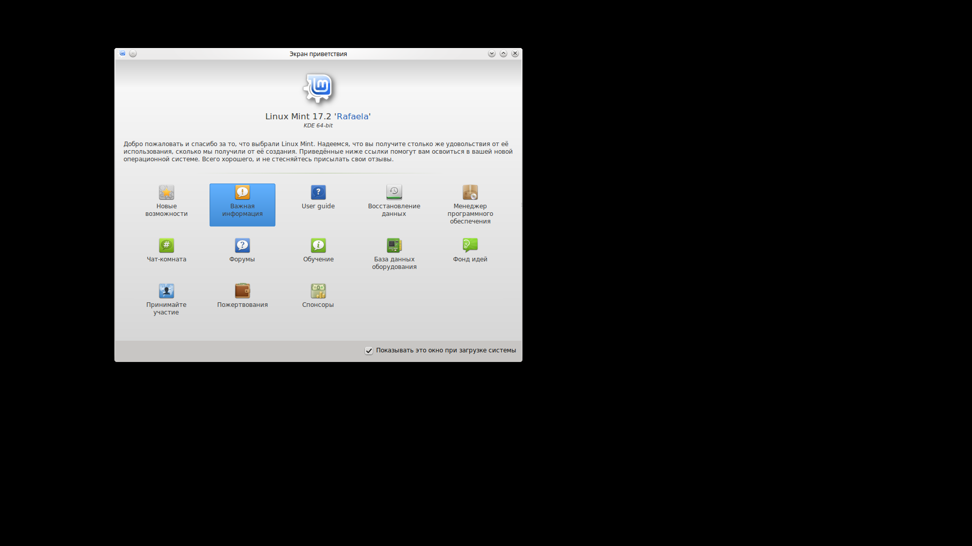 Добрый день! Внезапно после загрузки системы Linux Mint 17.2 "Rafaela" KDE Edition перестал появляться рабочий стол и меню. Загружается тлько экран приветствия, откуда можно выйти в браузер. Перезгрузка не меняет ничего.