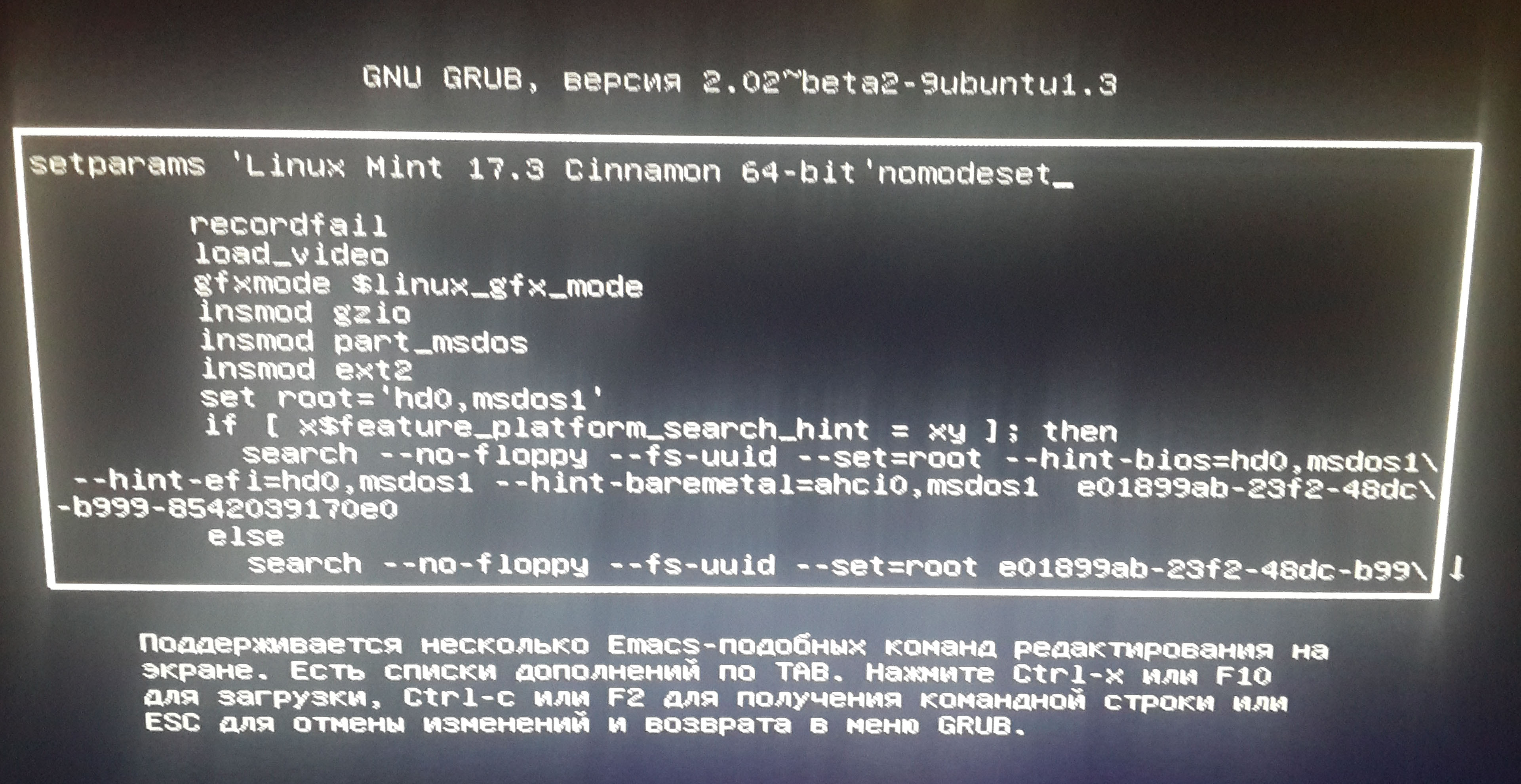 zen, ТС один раз уже написал, сейчас еще раз также напишет. Ему нужно вот так - ищешь строку, в конце которой написано "quiet splash", дописываешь после quit splash nomodeset, вот так - "quiet splash nomodeset" Если убрать quiet splash, то увидишь весть процесс загрузки. Без всякого логотипа Минт. |