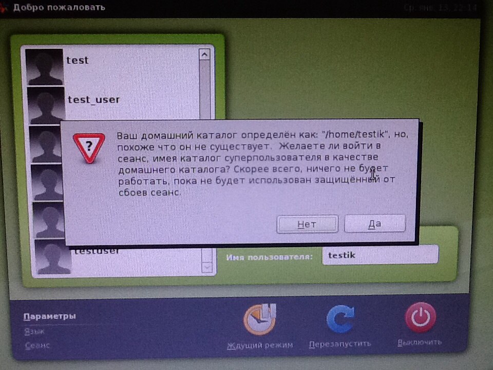 Попробуйте вручную создать в каталоге home своего пользователя, если его нет. Включите просмотр скрытых файлов и каталогов в файловом менеджере, скопируйте содержимое /etc/skel/ в /home/testic/ или как там он у Вас называется... | ||
