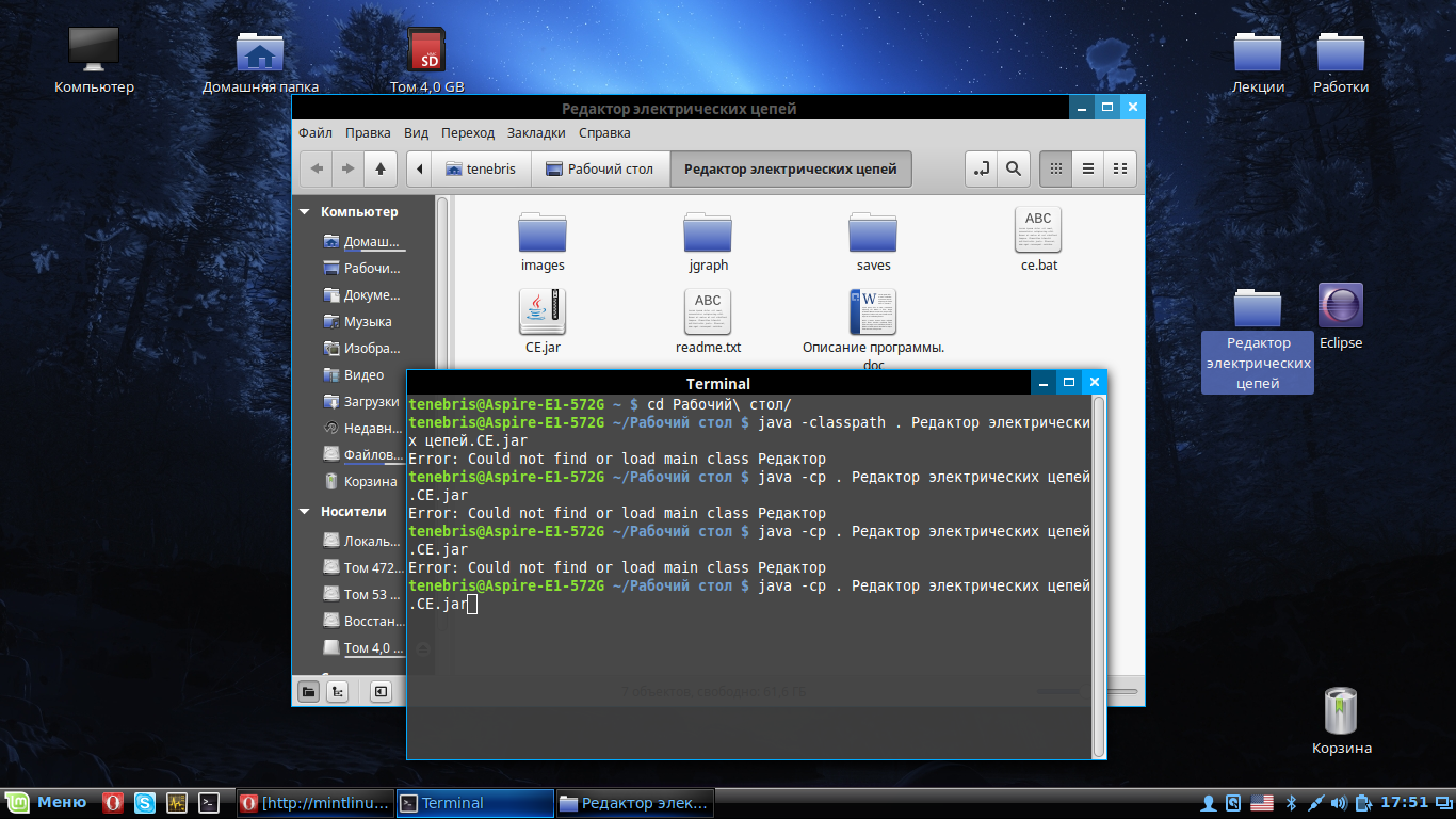 tenebris@Aspire-E1-572G ~ $ cd '/home/tenebris/Рабочий стол/Редактор электрических цепей' tenebris@Aspire-E1-572G ~/Рабочий стол/Редактор электрических цепей $ java CE.jar Error: Could not find or load main class CE.jar tenebris@Aspire-E1-572G ~/Рабочий стол/Редактор электрических цепей $ java 'CE.jar' Error: Could not find or load main class CE.jar tenebris@Aspire-E1-572G ~/Рабочий стол/Редактор электрических цепей $ Вот,скопипастил с терминала |