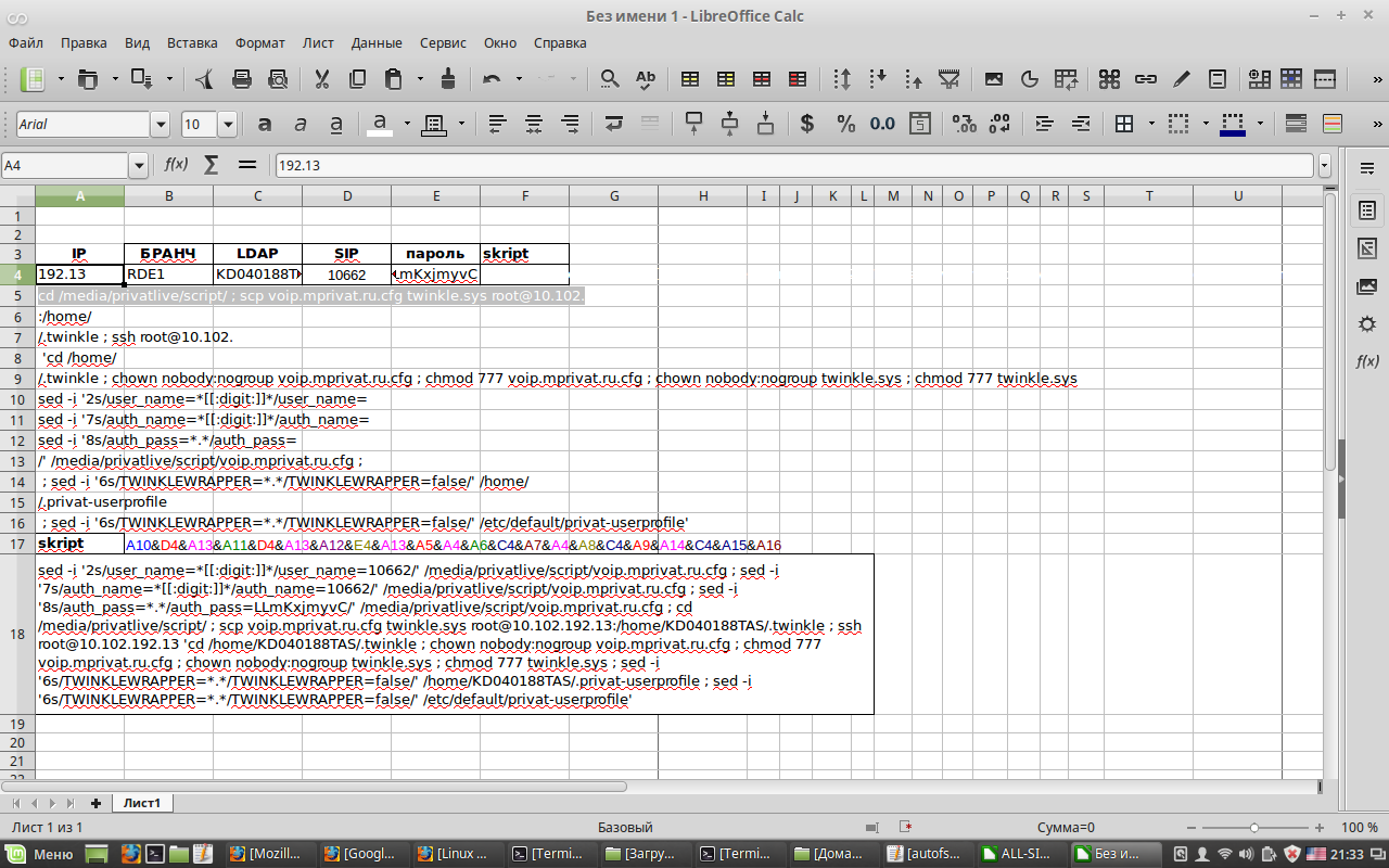 Код BASH:OUTPUT=$(zenity --forms --title="ВВОД" --text="ВВОД ДАННЫХ" --separator="," --add-entry="IP" --add-entry="Бранч" --add-entry="LDAP" --add-entry="SIP" --add-password="Password")