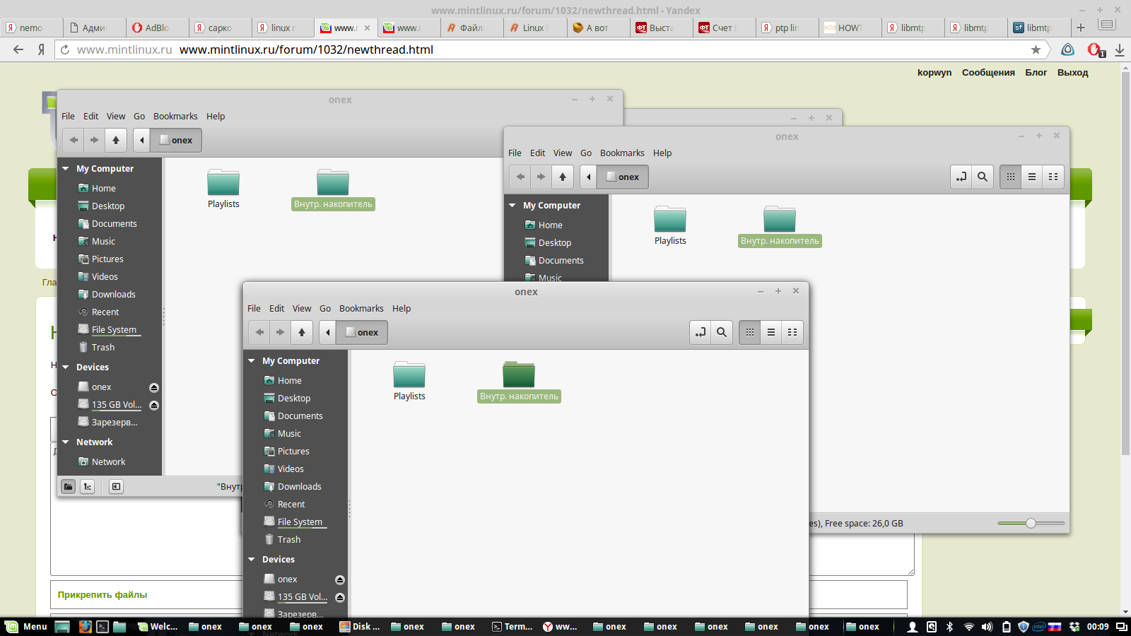 Сообщений: 0 | Доброго дня. Mint Rosa. Сначала были проблемы с MTP, из коробки не видел Lenovo ZUK Z1, настроил через mtpfs Теперь начались странные глюки. Если из Немо кликнуть на "Внутренний накопитель" (см. Аттач), он дублирует окно вместо открытия папки. Из терминала всё открывается. Disk Analyzer показывает все папки. Кто-нибудь может подсказать? |