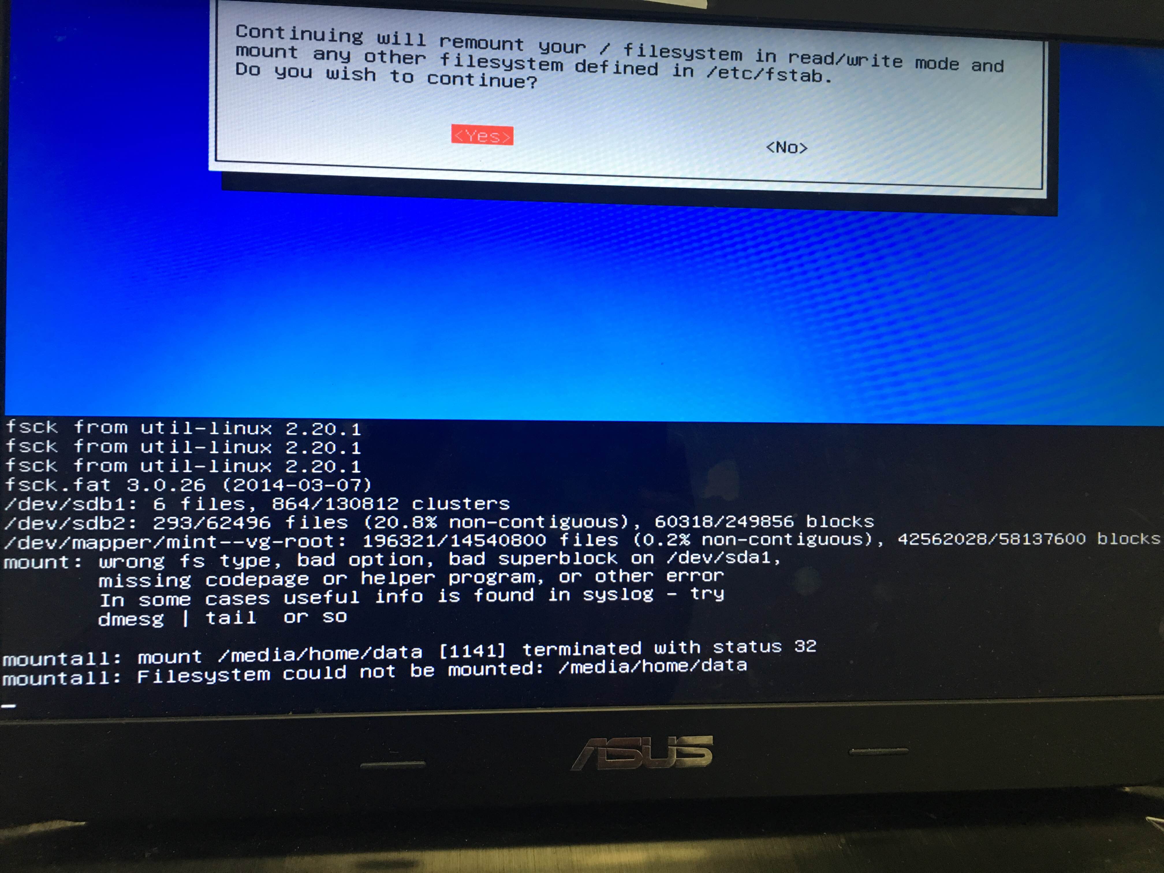 еле разглядел, что там написано: RUN fsck MANUALY загрузись с флешки и запусти команду fsck -y /dev/sda7 | ||||||||