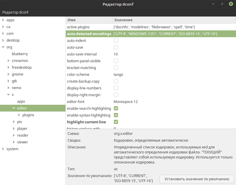 | dex tor: | Всем привет Установил mint 18 и файлы открываются с кракозябрами, попробовал сделать следующее gsettings set org.x.editor auto-detected-encodings "['UTF-8', 'WINDOWS-1251', 'CURRENT', 'ISO-8859-15', 'UTF-16']" Результата никакого нет, открывается также со знаками вопроса. Что еще можно сделать? | Ставим dconf-editor и делаем по фото |