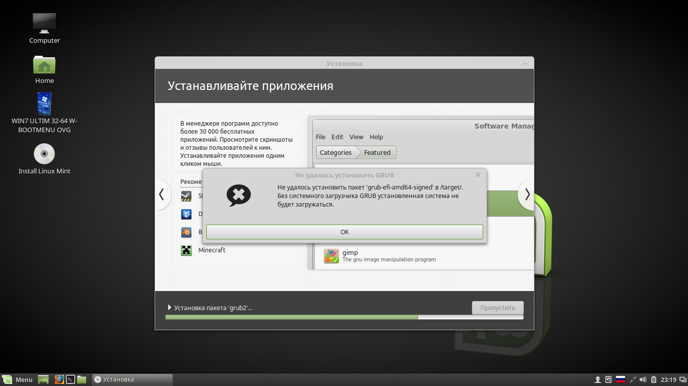Проблема в тому что в конце установки линукс выдает такое сообщение не удалось установить пакет grub-efi-amd64-signed в target.... не могу понять в чем причина... Образ качал с офф сайта, делал две разные загрузочные флешки. И результат тот же.ставил Linux mint рядом с windows 7. Загрузочную флешку делал программой руфус(mbr для компьютеров с bios или uefi) Прикрепленные файлы: