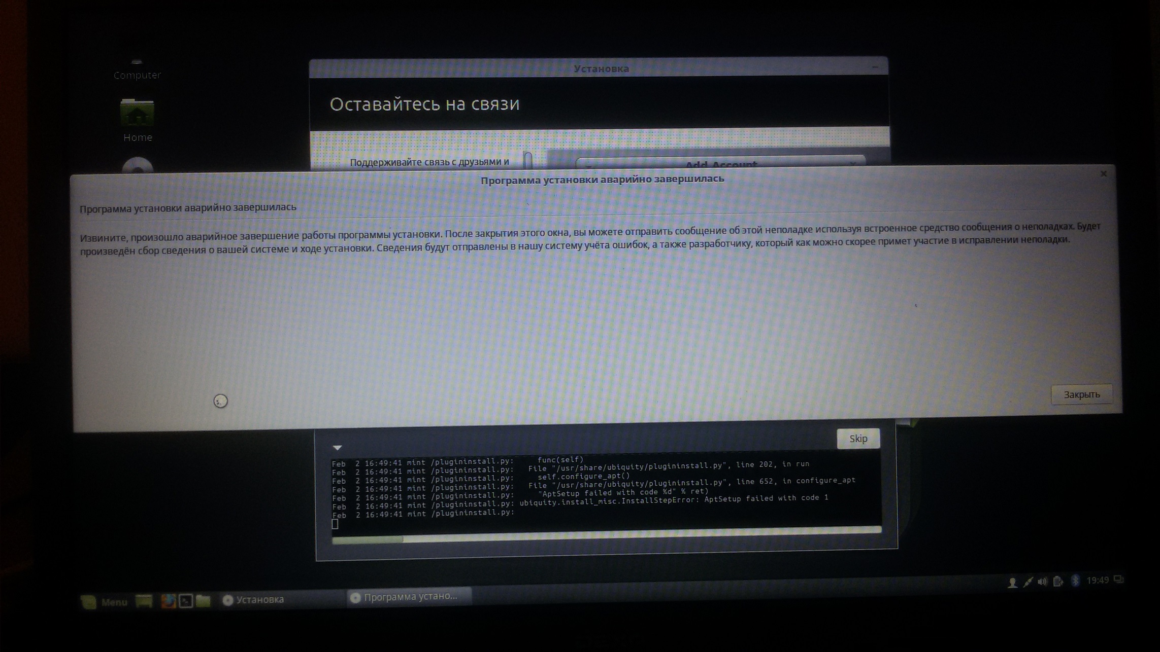 На жестком уже стоит Win10, пытаюсь установить Mint на оставшееся место винта и вроде бы уже установка завершена, как каждый раз прерывается на этом месте: <скрин приложил>. Оригинал фото на обменнике: https://mega.nz/#!MF5XlASa!CJtdW3_qHpMZSfhegKNgBsGWs7quuRyIWlKp6sdF6T0