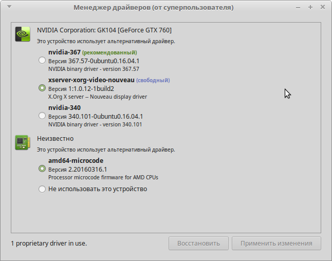 При установке Linux Mint 18.1 в менеджере драйверов на видео карту есть 3 варианта.