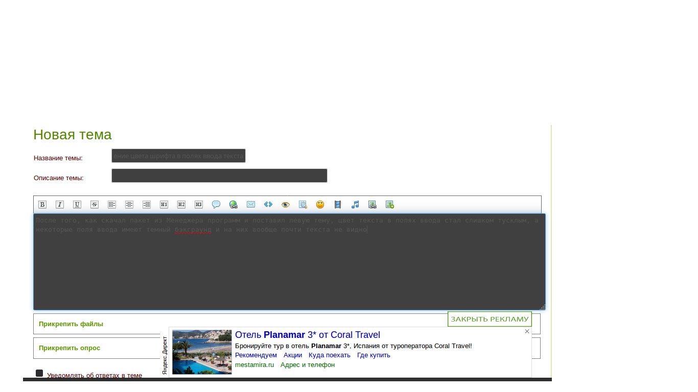 После того, как скачал пакет из Менеджера программ и поставил левую тему, цвет текста в полях ввода стал слишком тусклым, а некоторые поля ввода имеют темный бэкграунд и на них вообще почти текста не видно, нужно как-то изменить текст мануально для светлых полей и отдельно для темных OS - Linux Mint 18.1 64x Редактировалось: 1 раз (Последний: 28 июня 2017 в 08:47) |