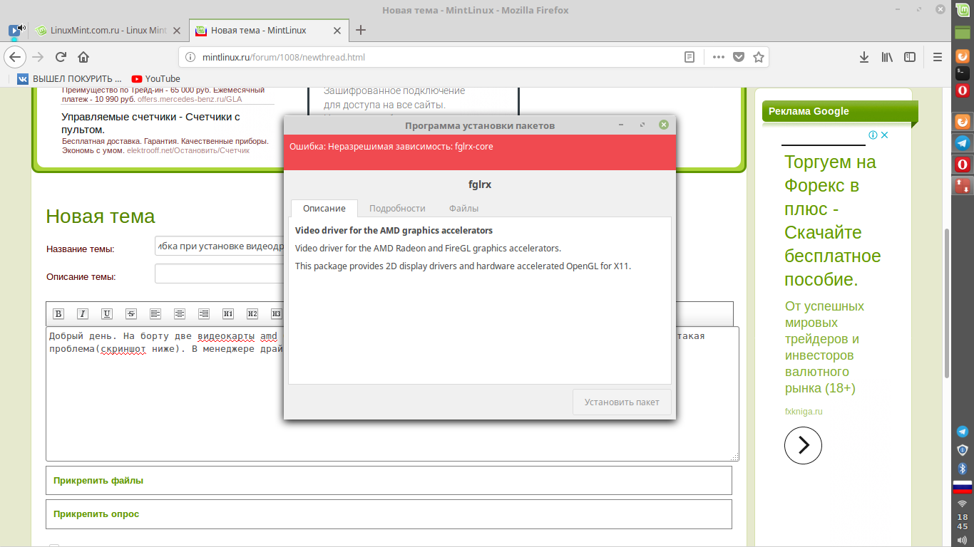 Добрый день. На борту две видеокарты amd 6000 серий, скачал соответствующие драйвера с сайта амд, при запуске такая проблема(скриншот ниже). В менеджере драйверов отсутствует fglrx. Подскажите, как правильно установить Прикрепленные файлы: