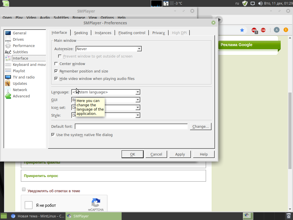Добрый день! Скачал установил линук минт мате с нуля, установил хромиум и смплеер, изначально эти оба приложения были на английском после sudo apt-get update и обновления языковых пакетов хромиум стал на русском, а смплеер нет. В настройках смплеера во вкладке интерфейс язык выбран system language и нет возможности выбрать другой язык. Как это можно победить? П. Ы. На Ubuntu mint просто в настройках смплеера выбирался язык и всё. подозреваю что с kodi будет такая же бяда... |